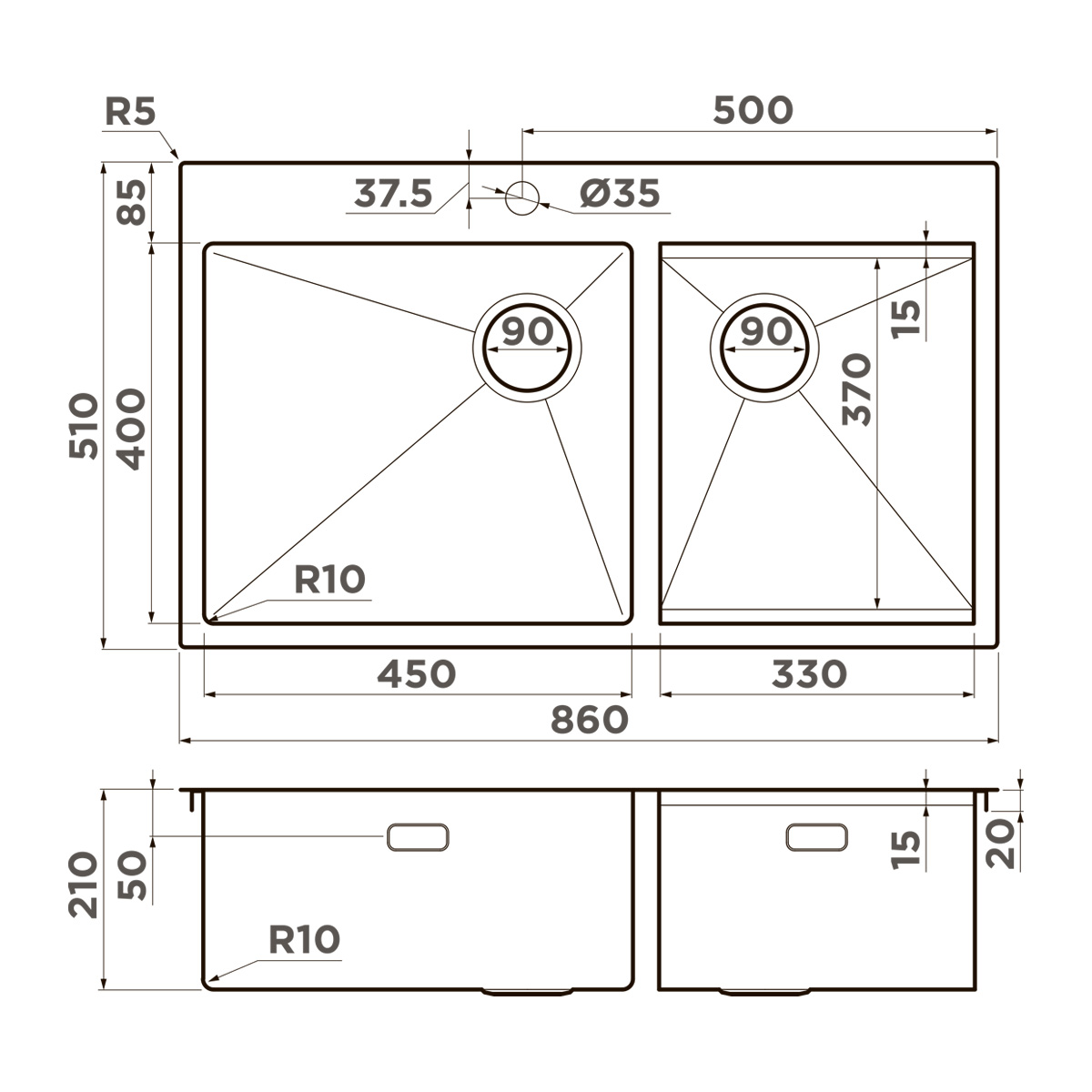 Схема с размерами на русском языке для мойки Omoikiri AKISAME 86-2 SIDE IN
